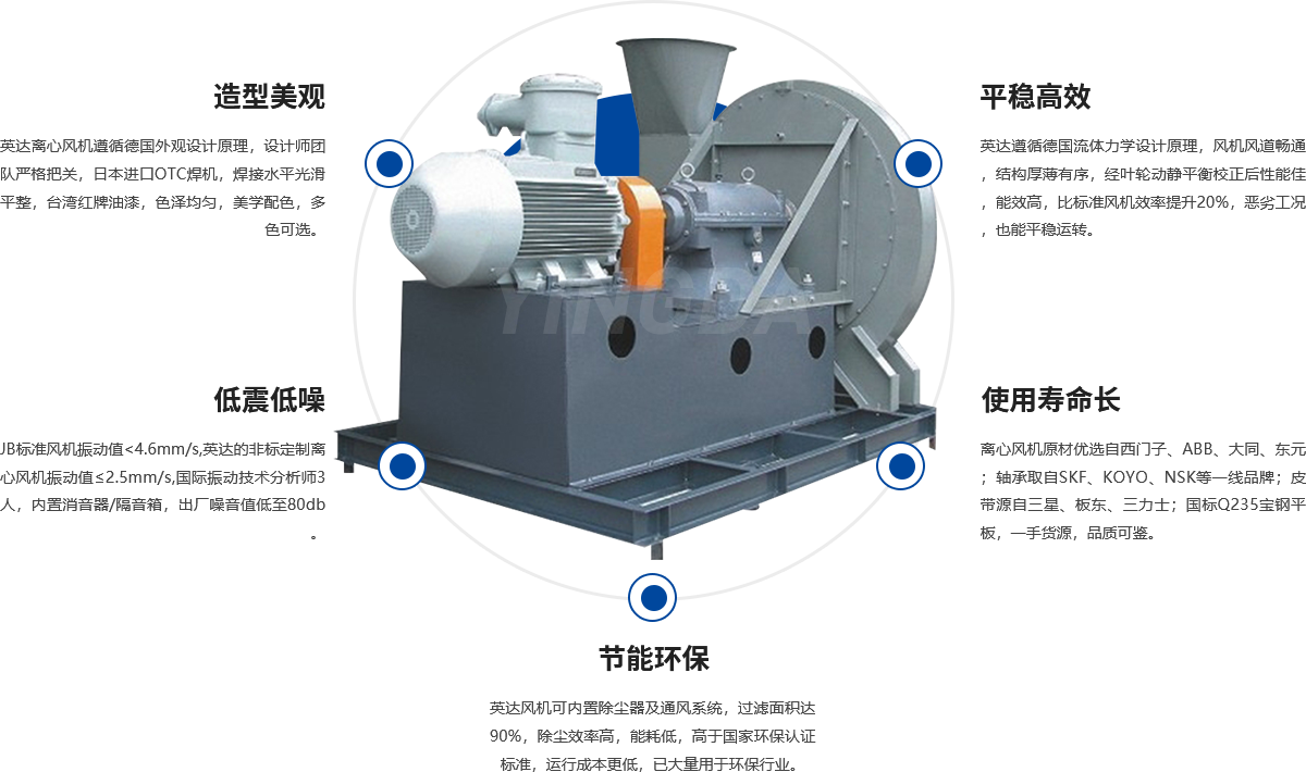高壓離心通風機(jī)廣泛用於環保(bǎo)行業(yè)、通風送風、粉塵送排風行業、工(gōng)業(yè)爐行業等等等各個(gè)領(lǐng)域,是工農業生產中主要耗能(néng)設備之一。離心式通風機是除塵通風係(xì)統中四大件之一, 是一種比較精密的運轉機械,依靠葉輪的轉動在風機內(nèi)部形成負壓,將外界氣體吸入並經葉輪流道和蝸殼排出風機。 離心式通風機主要由機殼、 葉輪、 機軸、 集流器、 排氣(qì)口、 軸承(chéng)箱體、聯(lián)軸器、 皮帶輪及底座等部件組成。