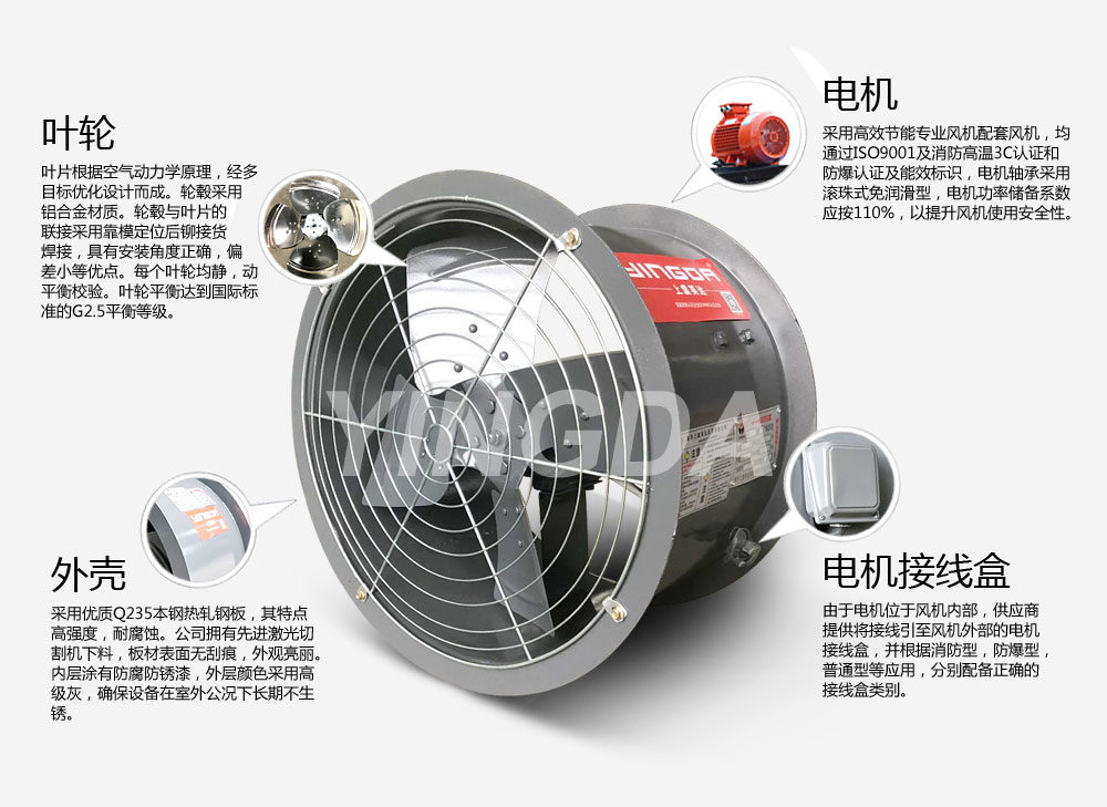 ——防爆型:電機為(wéi)隔爆型、葉片為(wéi)鋁合金,適用於易燃、易爆氣體的環(huán)境中,防爆等級為EXdIIBT4、EXdIICT4。