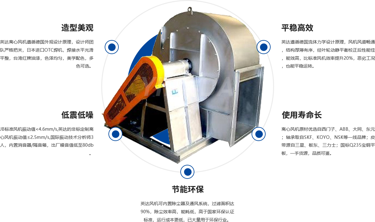 風(fēng)機葉輪、機殼可選(xuǎn)用(yòng)優質Q235碳鋼,304不鏽鋼(gāng),玻璃鋼(gāng)纖維,全部模具化生產,采(cǎi)用電焊、手段,表麵清潔平整(zhěng)、不存在焊接變形現象,葉輪(lún)經動、靜平衡校正,其平衡精度不大於4.0級。
