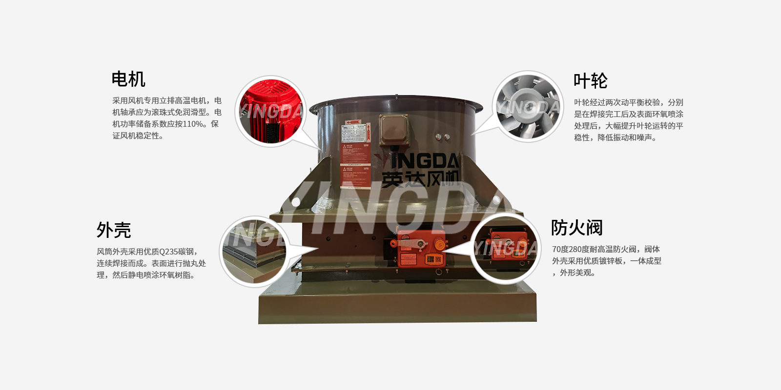 1.1.DWT(HTF)型軸管廊消防排煙,其基本形式為軸流屋頂式結構,電機采(cǎi)用耐高溫電機,產品按GA211-2009《消防排煙風機耐高溫試(shì)驗方法(fǎ)》進行耐高溫(wēn)試驗,通過公安部消防產品合格評定中心3C強製性認證,可在介質(zhì)溫度280℃。高溫條件下連續運(yùn)轉30分鍾以上,100℃溫度條(tiáo)件下連續20小時/次不損壞,可通風(fēng)排煙兩用。